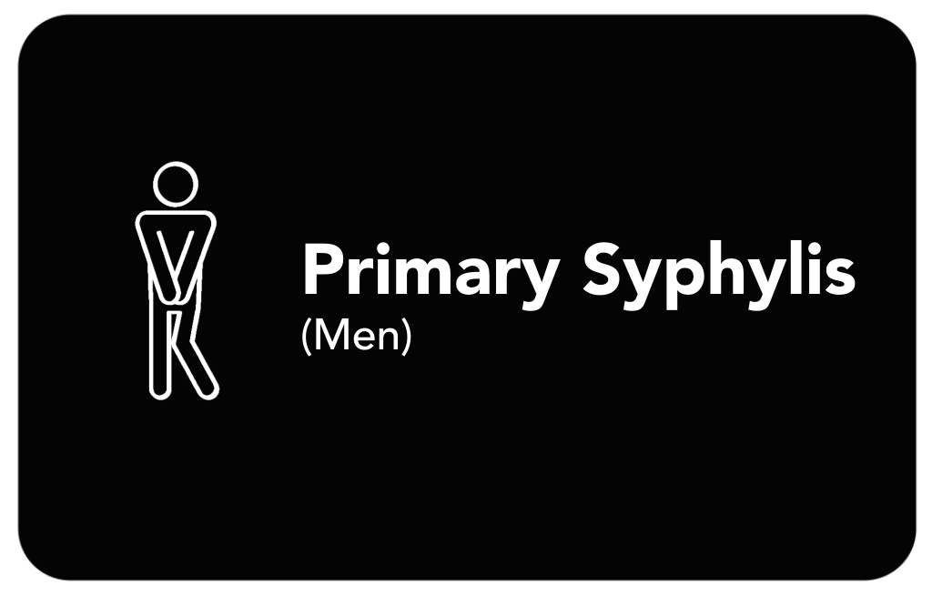 In men, Primary syphilis can present as a painless sore or ulcer at the site of infection, which is usually the genital area. But it can also occur on the lips, mouth, or anus swollen lymph nodes, mild fever, fatigue and muscle aches are other symptoms.