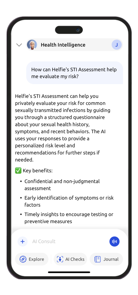 One of the standout features of Helfie AI is its intelligent STI assistant, powered by Chat mode and STI AI, designed to guide individuals through questions about sexual health with clinically informed, personalised insights, all in a private, stigma-free space.